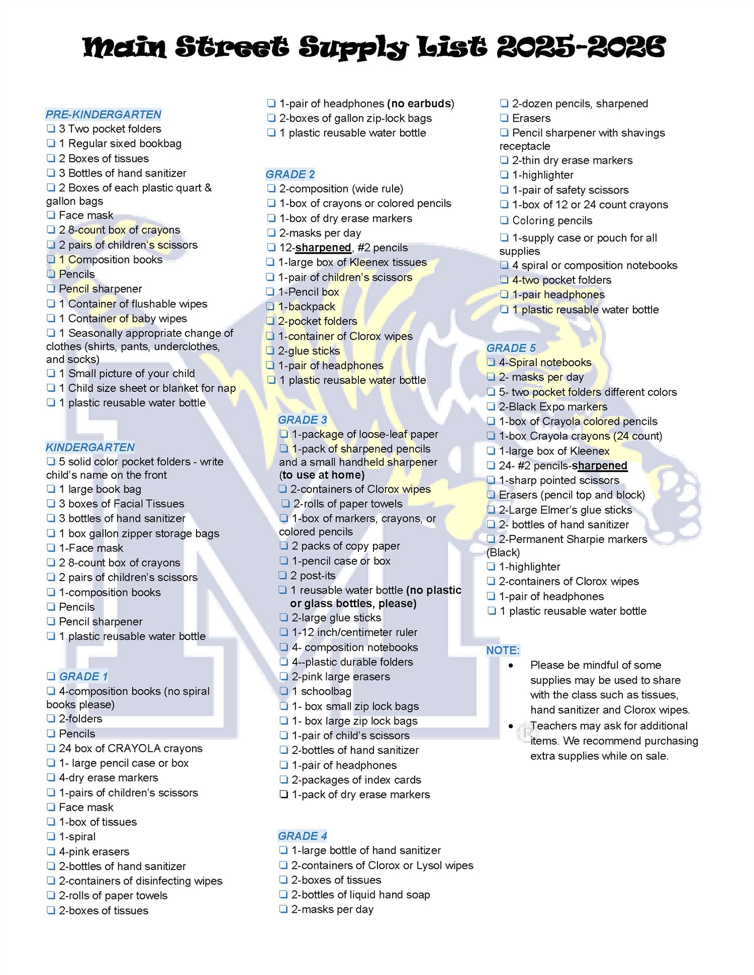 Main Street Supply List 2025-2026